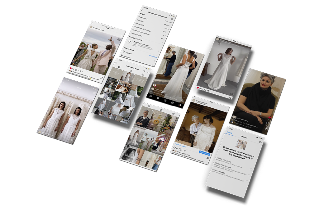 Social vissuti come spazio narrativo, senza usare foto di collezionde dei brand, ma per valorizzare collezioni, lavoro sartoriale e il rapporto umano con ogni sposa, creando un legame emozionale, coinvolgente con il pubblico.